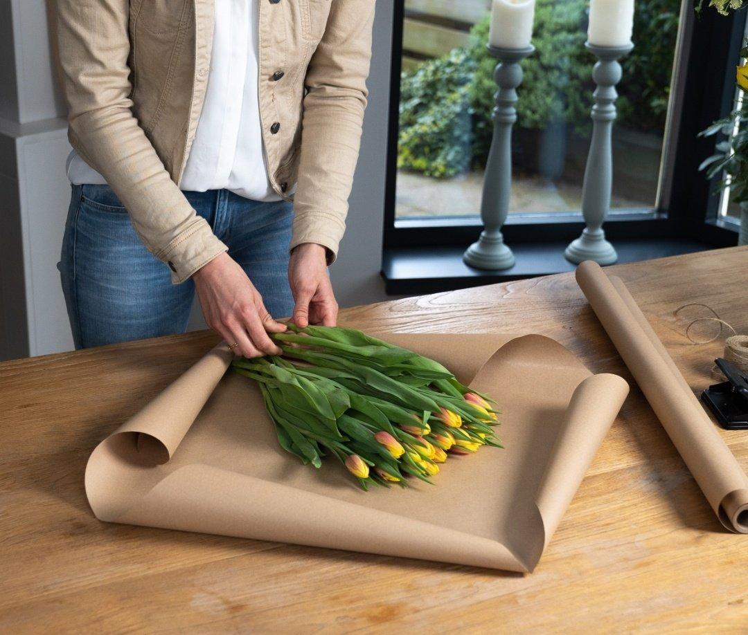 - Place the flowers on a piece of kraft paper. Fold the bottom of the paper inwards. Then fold the right and left flap over each other and secure with tape. Make sure the flowers are still nicely visible.
