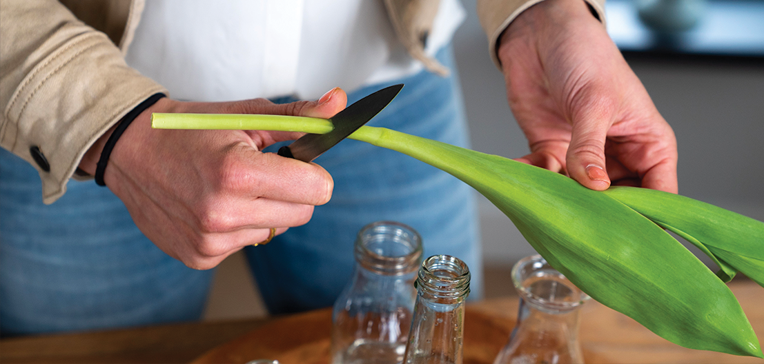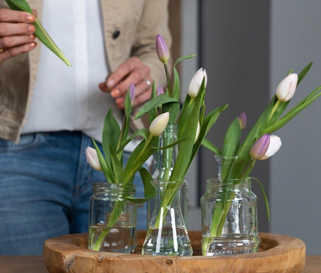 - Przytnij tulipany na krótko, przy czym długość łodyg powinna być różna, aby uzyskać figlarny efekt. Włóż kwiaty do wazoników.